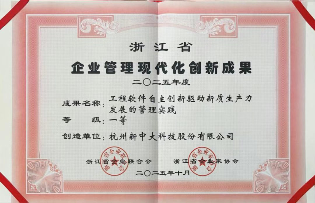 12月21日,由浙江省企業(yè)聯(lián)合會、浙江省企業(yè)家協(xié)會、浙江省工業(yè)經(jīng)濟(jì)聯(lián)合會聯(lián)合主辦的“打造浙江發(fā)展新引擎——2025浙江省企業(yè)家活動日”在杭州隆重舉行。大會現(xiàn)場揭曉了“2025年浙江省企業(yè)管理現(xiàn)代化創(chuàng)新成果”名單,杭州新中大科技股份有限公司(以下簡稱“新中大科技”)申報的《工程軟件自主創(chuàng)新驅(qū)動新質(zhì)生產(chǎn)力發(fā)展的管理實(shí)踐》在全省眾多申報項(xiàng)目中脫穎而出,榮獲一等獎,并作為獲獎代表受邀參與現(xiàn)場領(lǐng)獎。該獎項(xiàng)由浙江省企業(yè)聯(lián)合會、浙江省企業(yè)家協(xié)會和浙江省工業(yè)經(jīng)濟(jì)聯(lián)合會聯(lián)合主辦,是全省最具權(quán)威性與影響力的企業(yè)管理類榮譽(yù)之一,旨在推廣可復(fù)制、可借鑒的先進(jìn)管理經(jīng)驗(yàn),助力企業(yè)建設(shè)。
